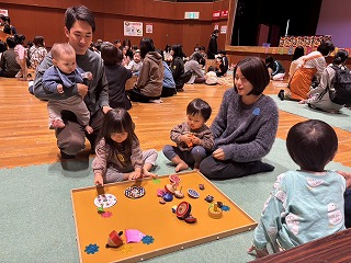 昔遊びコーナーは人気のコマ遊びの他に折り紙やお手玉竹返しにも挑戦。